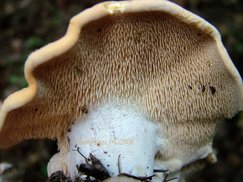 marge épaisse, largement enroulée au début puis s'étalant et devenant lobée et sinueuse ; | | | | Aiguillons: | | serrés, décurrents, longs de 3-5 mm, fragiles, blancs puis crèmes et brunissants ; | | | | Pied : | | épais, charnu, trapu, plein, de 3 à 8 x 1 à 4 cm, difforme, excentré rarement central, s'épaississant à la base, blanchâtre puis roussissant par endroits ; | | | | Chair : | | épaisse, ferme, cassante, blanche fonçant légèrement au contact de l'air, très légère odeur agréable, saveur parfois légèrement amère ; | | | | Spores : | | sporée blanche, non amyloïde ;