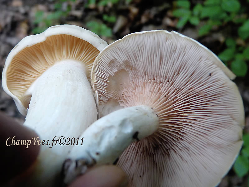 Ne pas confondre notre Clitopile petite prune à droite avec sur la gauche : Entoloma lividum, l'entolome livide, très toxique ; Tous deux présentent une très bonne odeur et saveur de farine et tous deux ont une sporulation rose. Par contre, l'entolome livide dans son jeune à ge présente des lames jaunes qui, très vite, passeront au rosé pâle de la couleur des spores.