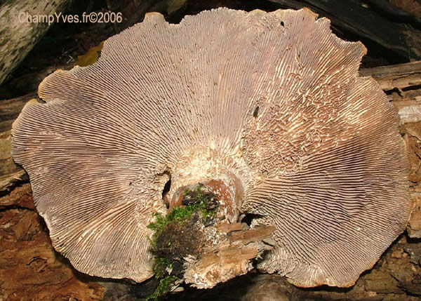 Chapeaux : | | 10-15 cm, convexe puis plat et enfin déprimé, velouté et même un peu squamuleux au centre, ocracé, fauve jusqu’au brunâtre roussâtre ; | Lames : | | décurrentes, étroites, serrées à arêtes érodées, fourchues ou anastomosées à la base, crème ocracé ; | Pied : | | 8 x 2,5 cm, assez massif surtout quand jeune, excentrique (excentré) ou non, plus ou moins squamuleux, crème ochracé plus sombre et roussâtre à la base (photo 1) ; | Chair : | | assez tenace, blanchâtre, bonne odeur acidulée de sous-bois, saveur douce ; | Spores : | | sporée blanche, non amyloïde ; spores cylindriques, 10-14 x 4-5 µm ; | Comestibilité : | | non comestible. | Le Lentin de Schaeffer, ce champignon peu commun, plutôt massif, bien souvent ombiliqué en son centre, fréquente les forêts humides ou marécageuses pour coloniser souches et bois morts de peupliers, saules plus rarement conifères. Les lames blanchâtres très décurrentes sont serrées, étroites et sont assez particulières quand le champignon est tout jeune, elles sont très peu développées, pratiquement inexistantes, pliciformes, fourchues, anastomosées et très décurrentes sur le pied massif. Puis le champignon prend de l'ampleur et les lames se développent mais restent tout de même assez étroites. La chair de ce champignon est aussi assez caractéristique, elle est très compacte, croquante, dégage une bonne odeur et saveur de champignon puis en vieillissant, cette chair devient terriblement tenace et coriace, de la consistance d'un caoutchouc des plus durs. Encore une autre remarque assez particulière de ce champignon qui vient, si vous avez la chance de le voir, en deux poussées. Une première au tout début du printemps, à l'époque ou l'on parcourt les bois à la recherche de nos morilles, poussée se terminant aux premières chaleurs (mai - juin), et une seconde, bien plus tard, en plein boom de la saison de nos carpophores préférés, celle-ci prenant fin en novembre (septembre - novembre). Pour exemple, la photo 1 a été prise en forêt Rhénane le 23 avril 2006, puis photo 5 à 7 sur une autre place mais toujours dans cette même forêt entre le 03 et le 13 mai, photos montrant l'évolution d'un petit groupe de lentins sur une grosse branche à terre de ce qui semble être du saule. La photo 2 montre un vieil exemplaire terriblement coriace pris exactement au même endroit et sur le même support, mais 2 ans plus tôt et au mois d'août. - - Synonymes latins :